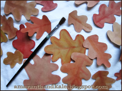 2. Paint your leaves. I used yellow red, brown, and black acrylics paint to mix up a variety of fall leaf colors. Some leaves I did a wash style painting using lots of water and a just a little paint. Other leaves I painted more thickly, but even then I diluted it some so it wasn't too thick. I wanted the colors to look rather muted. Some of them, I just painted evenly one color, others I did with more detail, others still I was more random with the coloring. Try a few things out to see what you like best. It's fun! Turn on some music or put on your favorite movie and paint away! Set them to the side to dry.