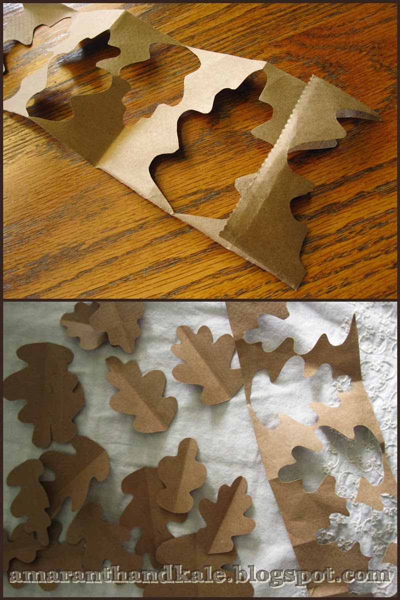 1. Cut out your leaves. I folded a section of paper in half and then just free-hand cut into an oak leaf shape, but you could choose any type of leaf shape you wanted. I cut out a variety of sizes and since I was free handing it, each leaf was a little different. I think it turned out really nice that way.